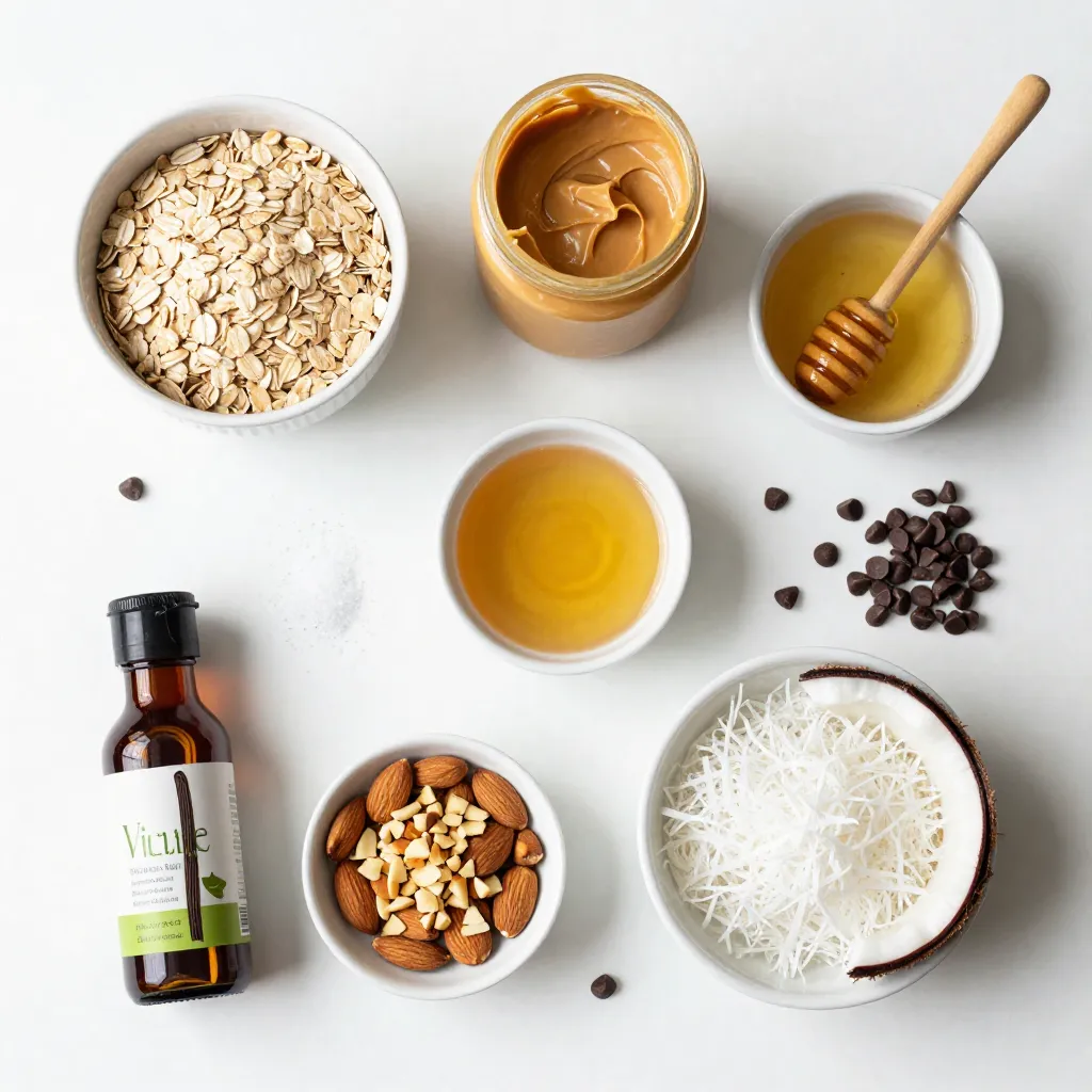 These ingredients make a tasty and healthy snack. The rolled oats give a good base. Almond butter adds creaminess and protein. Honey or maple syrup offers natural sweetness. Shredded coconut gives a nice texture. Chopped almonds add a satisfying crunch. Vanilla and almond extracts bring out rich flavors. A pinch of salt balances everything.