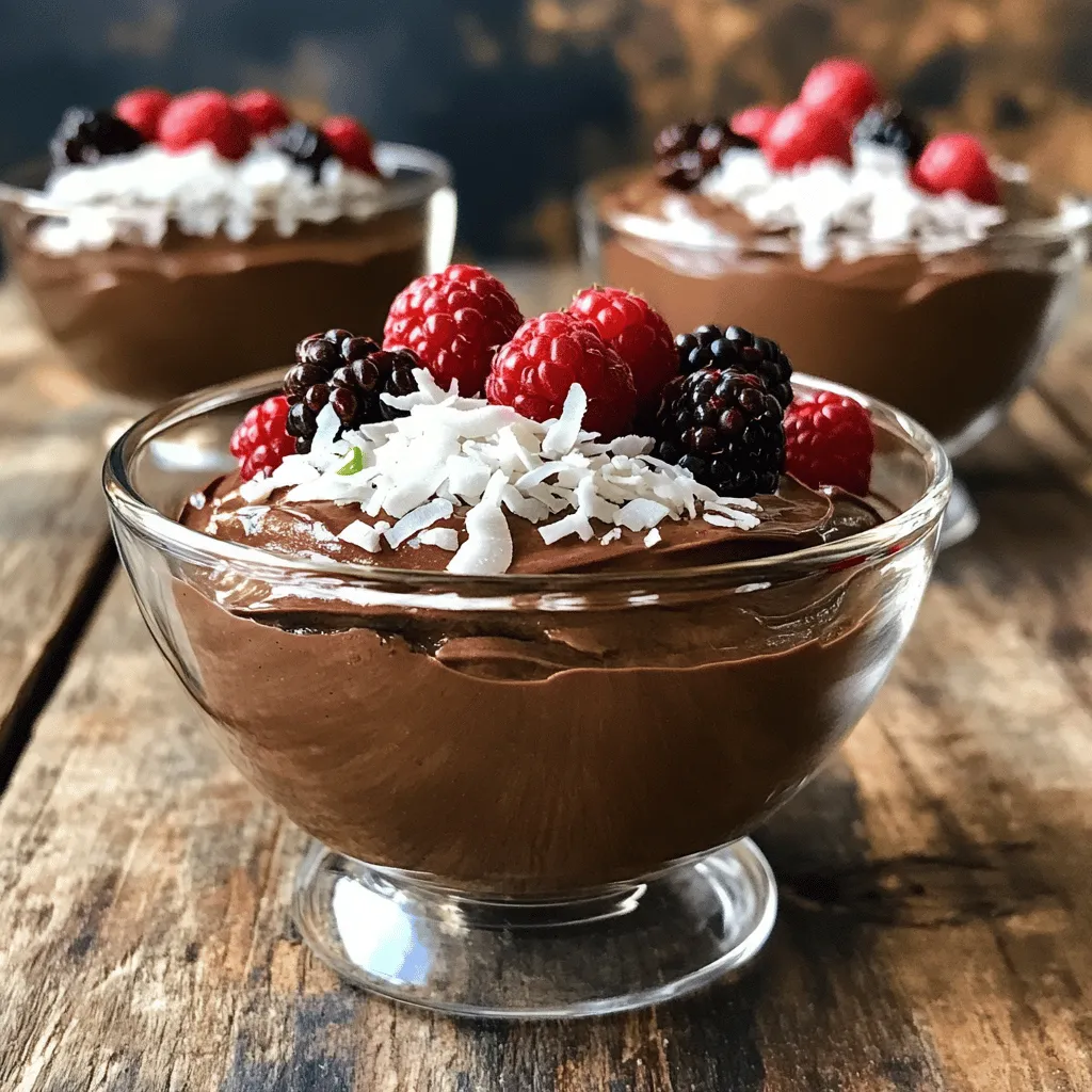 ![To make the vegan chocolate avocado mousse, you need just a few simple ingredients. Here’s the list: - 2 ripe avocados - 1/3 cup unsweetened cocoa powder - 1/4 cup maple syrup (adjust for sweetness) - 1/4 cup almond milk (or any plant-based milk) - 1 teaspoon vanilla extract - A pinch of sea salt - Optional toppings: shredded coconut, fresh berries, or chopped nuts Each ingredient plays a key role in creating a mousse that is rich and creamy. The ripe avocados provide a smooth base and healthy fats. Cocoa powder brings in the chocolate flavor, while maple syrup adds natural sweetness. Almond milk keeps the texture light and fluffy. Vanilla extract enhances the overall taste, and sea salt balances the flavors. You can also get creative with the toppings. Shredded coconut adds chewiness, fresh berries lend tartness, and chopped nuts offer crunch. Feel free to mix and match! For the full recipe, you can check the [Full Recipe]. - Slice avocados and remove pits. - Scoop flesh into a food processor. To start, take two ripe avocados. Cut each in half and gently remove the pit. This step is easy but be careful! Then, scoop the green flesh into your food processor. The texture of ripe avocados makes for a creamy mousse. - Add cocoa powder, maple syrup, almond milk, vanilla, and sea salt. - Blend until smooth and creamy. Next, it's time to add flavor. Pour in 1/3 cup of cocoa powder, 1/4 cup of maple syrup, and 1/4 cup of almond milk. You should also add 1 teaspoon of vanilla extract and a pinch of sea salt. Blend all these ingredients on high. Stop to scrape down the sides if needed. You want a smooth and creamy texture. - Taste test and adjust sweetness if preferred. - Transfer mousse to serving dishes and refrigerate. Once blended, taste your mousse. If you want it sweeter, add more maple syrup. Blend again to mix in the sweetener. After it reaches the taste you love, spoon the mousse into serving dishes. Cover and refrigerate for at least 30 minutes. This helps it firm up. For the full recipe, check the details above. To get a smooth mousse, blend well. I suggest using a high-speed blender or food processor. This way, you break down the avocado fully. Stop occasionally to scrape down the sides. This helps blend everything evenly. Ripe avocados are key. They must feel soft when you squeeze them gently. If they are too hard, the mousse will be lumpy. For a stunning look, garnish your mousse. Try adding shredded coconut on top. Fresh berries add a pop of color and flavor too. You can also sprinkle chopped nuts for a crunchy texture. Pair the mousse with mint leaves for a fresh taste. This combo makes your dessert even more delightful. Avocados are packed with good fats. They help keep your heart healthy. They also provide vitamins like E and K. Plus, they have fiber, which is great for digestion. Maple syrup is a better choice than white sugar. It has minerals and antioxidants. This makes your dessert not just tasty but also healthy. {{image_2}} You can make this mousse even more exciting. Try adding spices like cinnamon or a hint of chili powder. These spices bring warmth and depth to the flavor. You can also switch up your sweeteners. Use agave or coconut sugar for a unique twist. Each sweetener changes the taste slightly, so feel free to experiment. If you want to change the milk, you can use coconut or oat milk. Both options add a creamy texture. If you have nut allergies, just skip almond milk. You can easily find many plant-based milks that will work well. Just make sure they are dairy-free. Choosing the right cocoa powder can change the mousse's flavor. Raw cocoa gives a rich taste, while dark cocoa offers a deep, bold flavor. You can also add dairy-free chocolate chips. These chips create delightful chunks in your mousse. They add a fun texture and extra chocolatey goodness to this sweet treat. For the full recipe, check out the details above. To keep your vegan chocolate avocado mousse fresh, store it in the fridge. Place it in an airtight container. Cover the top with plastic wrap if you don't have a lid. This helps keep the mousse smooth and creamy. It can last about 3 to 5 days in the fridge. Always check for any changes in smell or color before serving. Yes, you can freeze vegan mousse! Freezing is a great way to save leftovers. To do this, use a freezer-safe container. Make sure to leave some space at the top. The mousse expands when it freezes. It can stay good for up to 2 months in the freezer. When you are ready to eat it, thaw it in the fridge overnight. If your mousse is too thick after refrigeration, you can fix it. Add a splash of almond milk and blend it again. This will help bring back the smooth texture. You can also use leftover mousse in new ways. Spread it on toast, add it to smoothies, or layer it in parfaits. Each idea adds a fun twist to your dessert! For the full recipe, check out the details above. Yes, Vegan Chocolate Avocado Mousse is healthy! This treat offers several nutritional benefits. - Avocados are rich in healthy fats, fiber, and vitamins. They support heart health and help you feel full. - Cocoa powder is packed with antioxidants. It can boost your mood and lower blood pressure. - Maple syrup provides natural sweetness and contains minerals like manganese and zinc. - Almond milk is low in calories and dairy-free. It’s a good alternative for those with lactose intolerance. Overall, this mousse is a wholesome dessert option that satisfies your sweet tooth without guilt. Yes, you can make this mousse ahead of time! It’s a great make-ahead dessert. - Refrigeration: Store the mousse in an airtight container. This keeps it fresh for up to three days. - Timing: Make it a few hours before serving. This allows the flavors to meld and the mousse to get firmer. I love making it the night before a gathering. It’s ready to impress your guests when you need it! If you want to swap avocados, you have options! - Silken tofu: It blends well and gives a creamy 