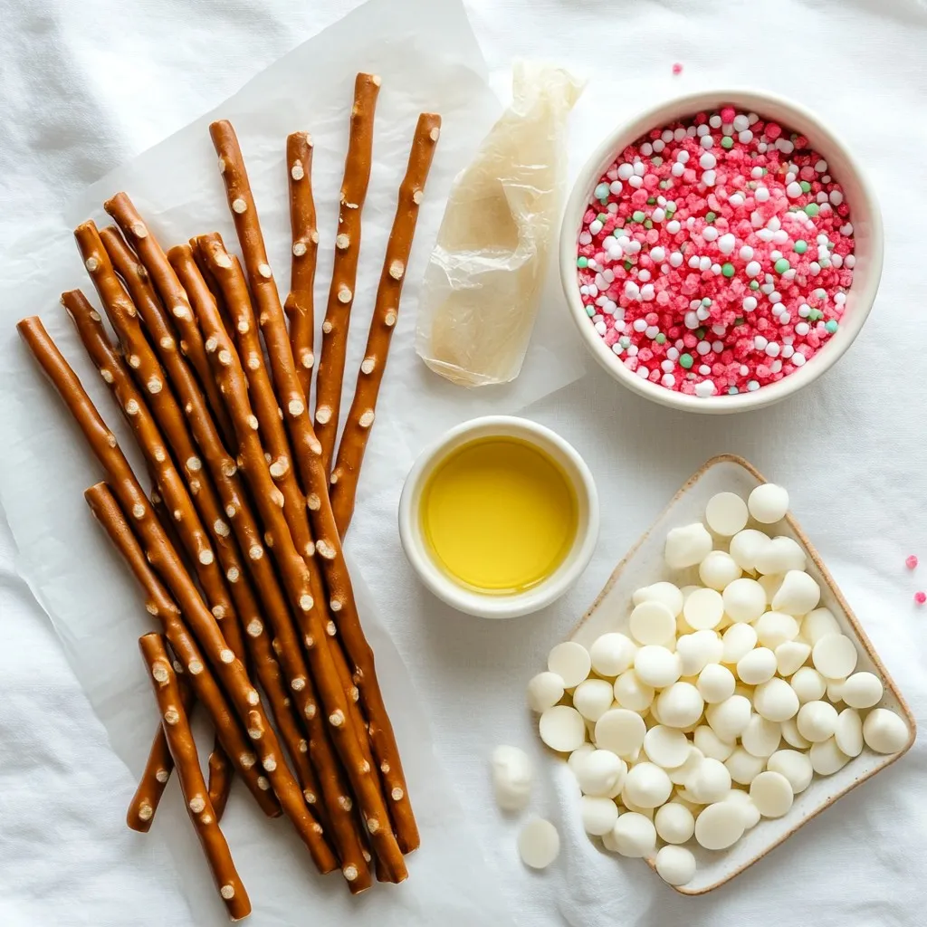 To create White Chocolate Peppermint Pretzel Rods, gather these ingredients. Pretzel rods give a nice crunch. White chocolate chips melt to make a sweet coating. Coconut oil helps the chocolate melt smoothly, but it’s not a must. Crushed peppermint candies add a burst of flavor. Festive sprinkles bring color and fun to the treat. Lastly, parchment paper keeps everything clean and easy to work with.