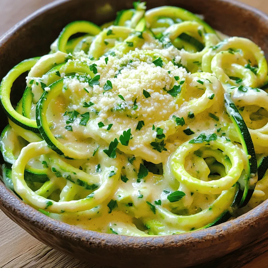 - 4 medium zucchinis: Spiralize these into noodles. They are the base of the dish. - 1 cup cauliflower florets: Steam these until tender. This adds creaminess. - 1 cup unsweetened almond milk: This keeps the sauce light and adds flavor. - 2 tablespoons nutritional yeast: This gives a cheesy taste without dairy. - 2 cloves garlic: Mince them for a strong, aromatic flavor. - 1 tablespoon olive oil: Use this to sauté the garlic for a rich taste. - Salt and pepper: These enhance all the flavors. Add to taste. - 1 tablespoon fresh lemon juice: This brightens the dish and adds zing. - Fresh parsley: Chop this for garnish; it adds color and freshness. - Grated Parmesan cheese: Use this or a vegan alternative for extra flavor. For the complete recipe, check out the Full Recipe. First, spiralizing zucchinis is easy. You can use a spiralizer or a peeler. Make sure to create long, thin noodles. Set them aside in a bowl. Next, steam the cauliflower florets. This makes them soft and ready for blending. You can steam them on the stove or in the microwave. Aim for about 5 minutes until tender. Now, let's sauté the garlic. Heat the olive oil in a small pot over medium heat. Add the minced garlic and cook for 1-2 minutes. Watch closely so it doesn’t burn; you want it fragrant and golden. Time to blend the creamy sauce. In a blender, combine the steamed cauliflower, almond milk, nutritional yeast, sautéed garlic, lemon juice, salt, and pepper. Blend until smooth and creamy. You might want to taste it and adjust the seasoning. Sauté the zucchini noodles in a large skillet. Cook them over medium heat for about 2-3 minutes. They should be slightly soft but still have a bite. Now, pour the creamy sauce over the zucchini noodles. Toss them gently to coat evenly. Cook for another 1-2 minutes until everything is hot. Serve the Zucchini Noodle Alfredo right away. Garnish with fresh parsley and grated Parmesan cheese or a vegan alternative. Enjoy this creamy healthy delight! For the full recipe, refer to the above instructions. To get the best texture from zucchini noodles, start by sautéing them right. First, make sure you spiralize the zucchinis well. This gives you long, thin noodles. When cooking, heat a large skillet over medium heat. Add the noodles and sauté for 2-3 minutes. You want them slightly soft but not mushy. This quick cook keeps them fresh and bright. For a creamy sauce, blending is key. Use steamed cauliflower florets for smoothness. Combine them with almond milk, nutritional yeast, and sautéed garlic in a blender. Blend until the mixture is silky. If it’s too thick, add a little more almond milk. Adjust the seasoning to your taste, too. Adding seasonings can make a big difference. Besides salt and pepper, try adding a pinch of nutmeg for warmth. You can also sprinkle in some Italian herbs like basil or oregano. These flavors bring out the best in your dish. For toppings, fresh parsley is a must. It adds a pop of color and freshness. You might also want to use grated Parmesan cheese or a vegan alternative. This adds richness and makes the dish even more satisfying. For a crunch, consider toasted pine nuts or walnuts on top. They add a nice bite to your creamy meal. For the full recipe, check out the detailed steps to create your Zucchini Noodle Alfredo. {{image_2}} You can easily swap some ingredients in this recipe. If you lack almond milk, use oat milk or soy milk. These will still keep your dish creamy. For nutritional yeast, try using cashew cheese or a vegan Parmesan. They give a nice cheesy flavor too. Also, if you want to mix it up, consider using butternut squash or spaghetti squash. Both add a different taste and texture to your dish. This recipe fits many diets. For vegans, stick to almond milk and skip the Parmesan. This dish stays creamy and tasty without dairy. If you need gluten-free options, check that your almond milk is certified gluten-free. This dish is naturally gluten-free if you use no flour. Lastly, if you follow a low-carb diet, you are in luck! Zucchini noodles are great for this. They contain fewer carbs than pasta. Enjoy your creamy Zucchini Noodle Alfredo guilt-free! For the full recipe, check out the Full Recipe section. To keep your Zucchini Noodle Alfredo fresh, store it in an airtight container. Make sure it cools down before sealing. Place it in the fridge as soon as possible. This dish can last up to three days in the fridge. If you notice any off smells or changes in texture, it’s best to toss it. When you are ready to enjoy your leftovers, use the stovetop for reheating. Heat a skillet over medium heat with a splash of almond milk. Add your Zucchini Noodle Alfredo and stir gently. This method helps keep the noodles from getting too soft. To refresh the flavors, add a squeeze of lemon juice or a sprinkle of fresh parsley. This little touch can revive your dish, making it taste fresh again. You can also microwave it, but be careful not to overheat. Heat it in short bursts, stirring in between, to maintain that creamy texture. How do you make zucchini noodles without a spiralizer? You can make zucchini noodles using a vegetable peeler. Just peel the zucchini into thin strips. You can also use a box grater. Grate the zucchini lengthwise to create long, thin noodles. Both methods work well for this dish. Can I use regular pasta instead of zucchini noodles? Yes, you can use regular pasta if you prefer. Cook the pasta according to package instructions. Just note that it won't be as low in carbs as zucchini noodles. The sauce will still taste great with any pasta you choose. Health benefits of zucchini and cauliflower Zucchini is low in calories and high in water. It supports hydration and digestion. Cauliflower is rich in fiber and vitamins. It may help to lower cholesterol and improve heart health. Both veggies boost your meal's nutrition. Caloric and nutritional breakdown per serving Each serving of Zucchini Noodle Alfredo has about 150 calories. It con